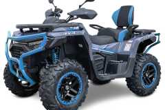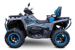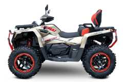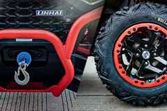Elektryczna wyciągarka o udźwigu 3000 Ibs, elektryczne wspomaganie kierownicy EPS, w pełni regulowane amortyzatory gazowo-olejowe z oddzielnym zbiornikiem, homologowany zaczep, 14-calowe felgi aluminiowe z systemem Beadlock, markowe 26-calowe opony Bulldog, masywne przednie i tylne zderzaki, aluminiowe antypoślizgowe podnóżki kierowcy i pasażera, kompozytowe przednie i tylne uchwyty, osłony dłoni, oświetlenie Full-LED, duży 7-calowy wyświetlacz TFT, dwukolorowe pikowane siedzenie i oparcie pasażera, malowane na kolorowo wahacze i sprężyny.