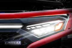 Mocne, smukłe, niskoprofilowe reflektory z diodami LED zwiększają widoczność i przyciągają uwagę, gdziekolwiek jesteś. A wraz z eleganckimi tylnymi światłami LED nadają quadowi Linhai Landforce niepowtarzalny, nowoczesny wygląd. Ponadto charakterystyczny, zaawansowany technologicznie wygląd uzupełniają charakterystyczne poziome światła do jazdy dziennej z cienkimi liniami diod LED z przodu i z tyłu. Wszystkie światła są zagłębione, aby zmaksymalizować ochronę przed uderzeniami.