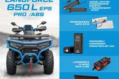 Quad Linhai Landforce 650L Pro oferuje wyjątkowo bogaty pakiet wyposażenia, który obejmuje w pełni regulowane amortyzatory typu o zwiększonej pojemności, solidne stalowe zderzaki z przodu i z tyłu, atrakcyjne ośmioramienne 14-calowe koła Beadlock wyposażone w duże 26-calowe opony Bulldog, aluminiowe antypoślizgowe podnóżki dla kierowcy i pasażera, dwukolorowe wyściełane siedzenie pasażera z oparciem lub dopasowane kolorystycznie wahacze. Wyposażenie obejmuje również elektryczne wspomaganie kierownicy, homologowany hak holowniczy, wyciągarkę o uciągu 3000 funtów, duży 7-calowy wyświetlacz z matrycą TFT, kompozytowe bagażniki z przodu i z tyłu lub stylowe osłony dłoni.