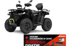 Wyciągarka elektryczna, przednia blokada mechanizmu różnicowego, cyfrowy wyświetlacz wielofunkcyjny, pełne oświetlenie LED, przedni zderzak, 12-calowe felgi aluminiowe, 25-calowe opony, amortyzatory hydrauliczne ze sprężynami progresywnymi, regulowane napięcie wstępne sprężyn, lusterka wsteczne.